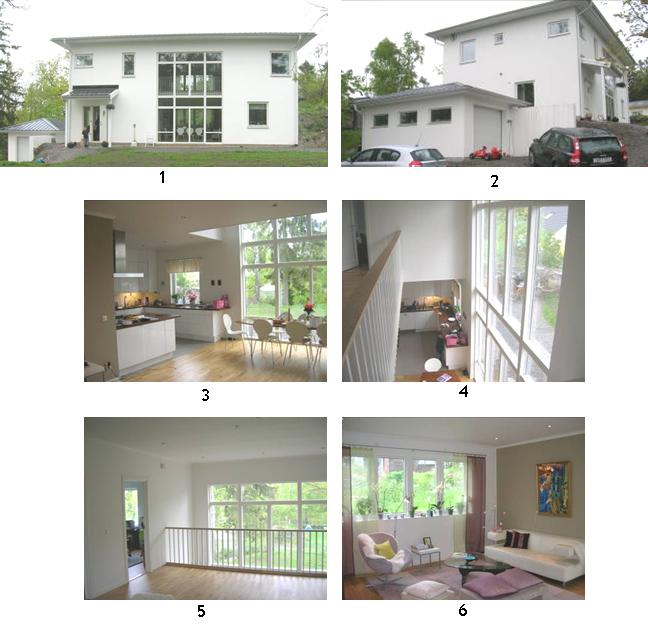 Miljöbilder 1. Huset från framsidan 2. Huset från gaveln med garaget 3. Köket och matplatsen 4. Köket från trapphuset 5. Övervåning 6. Vardagsrum nv